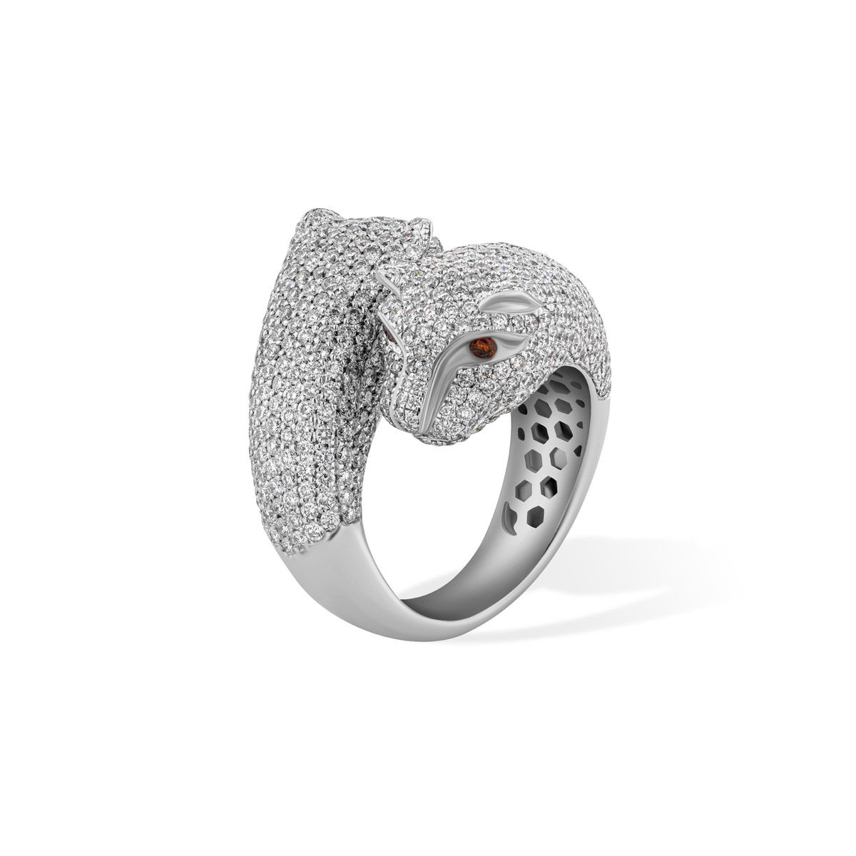 انگشتر برلیان طرح پلنگ ، جلوه ای از قدرت و ظرافت جاودانه است . سطح این کار با برلیان های درخشان پوشیده شده و چشمان رنگی نگین دار ، روحی زنده به طراحی بخشیده اند . ترکیب طلای سفید و جزییات دقیق ، این انگشتر را به اثری چشمگیر و با شکوه تبدیل کرده است .