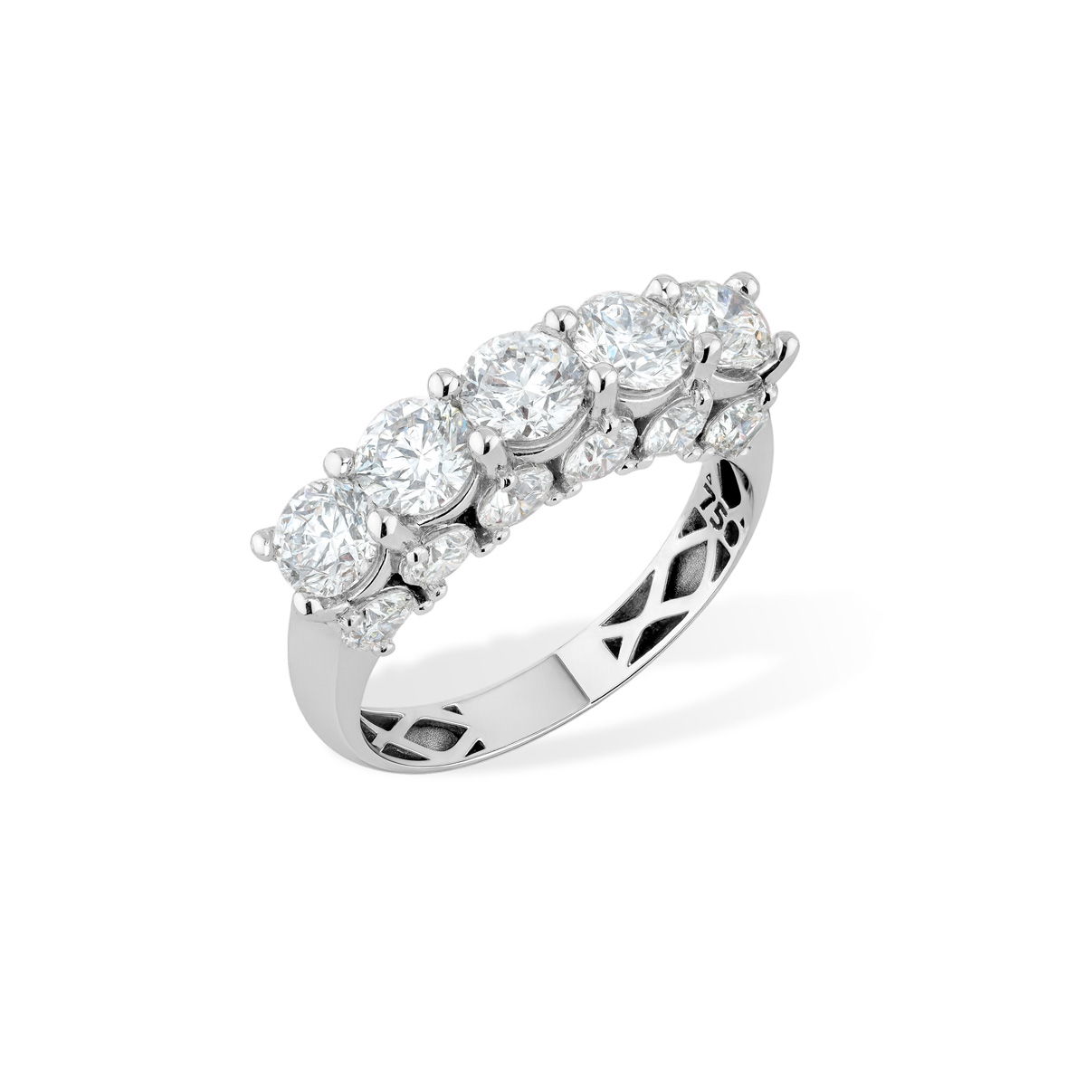 انگشتر برلیان فاخر با طراحی تمام عیارِ لوکس ؛ پنج تخمه اصلی 36 سوتی در مرکز کار می‌درخشند و دو طرف آن‌ها با برلیان‌ها‌ی 9 سوتی مزین شده است. ترکیب درخشش منظم سنگ‌ها، جلوه‌ای اشرافی و چشمگیر ایجاد کرده که این انگشتر را به انتخابی ماندگار و متفاوت تبدیل می‌کند.